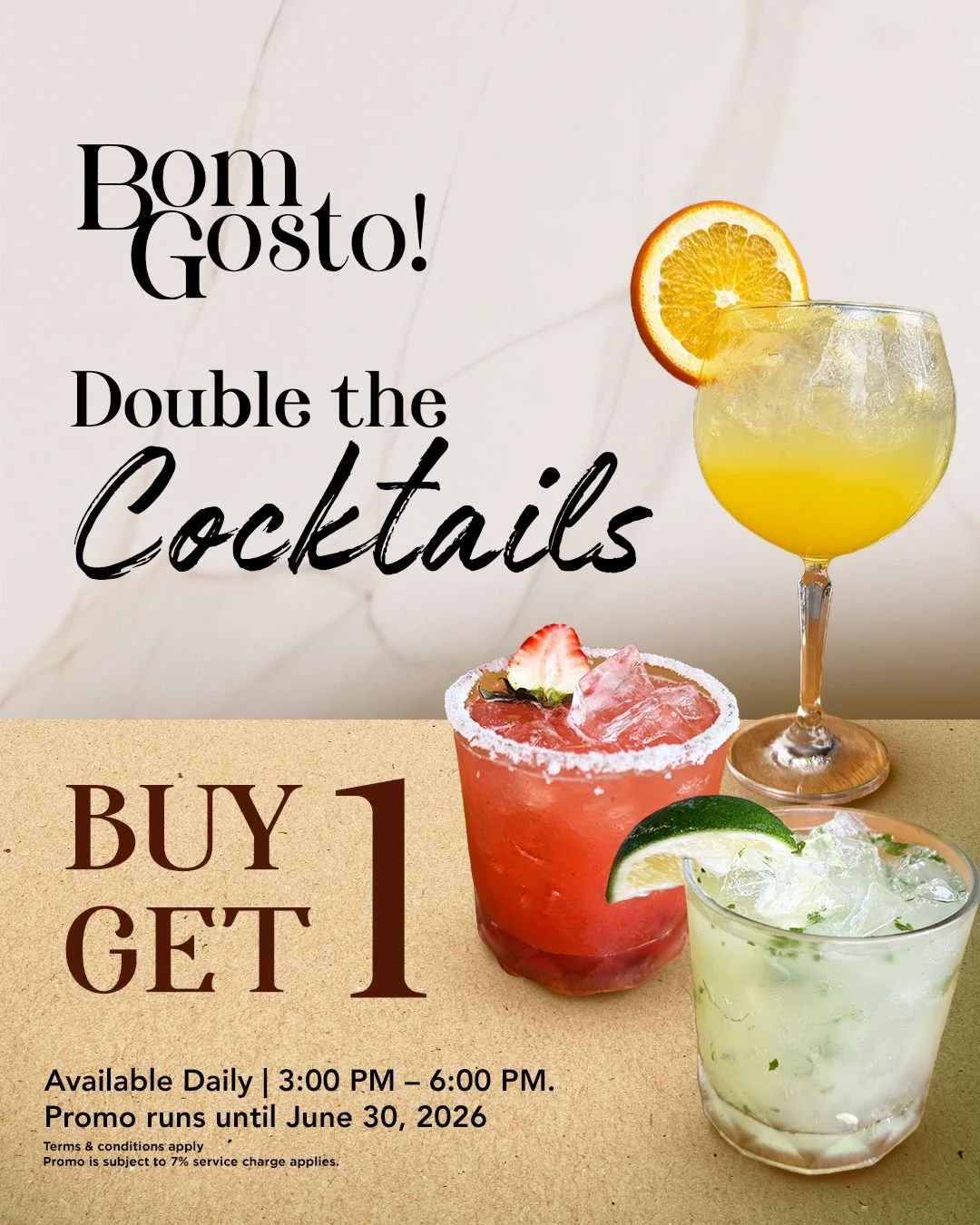 The BOGO Cocktails are available daily (including holidays) from 3:00pm to 6:00pm only