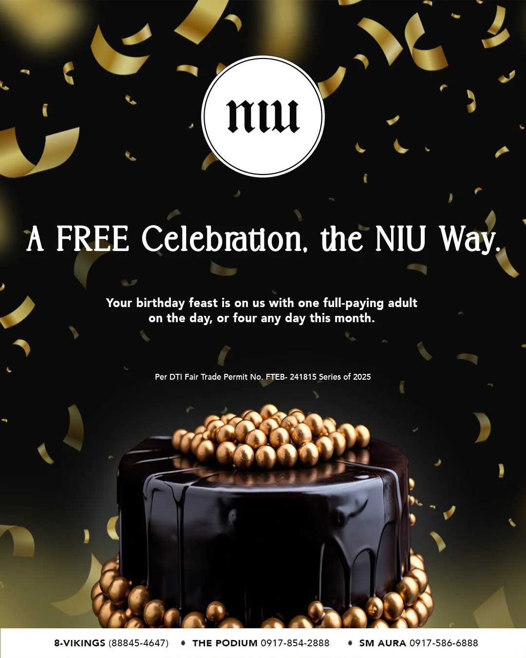 Celebrants can eat for free on any day WITHIN THEIR BIRTHDAY MONTH and should be accompanied by FOUR FULL PAYING ADULTS. (All Buffet Brands) *EXCLUDING NYX ONE AYALA