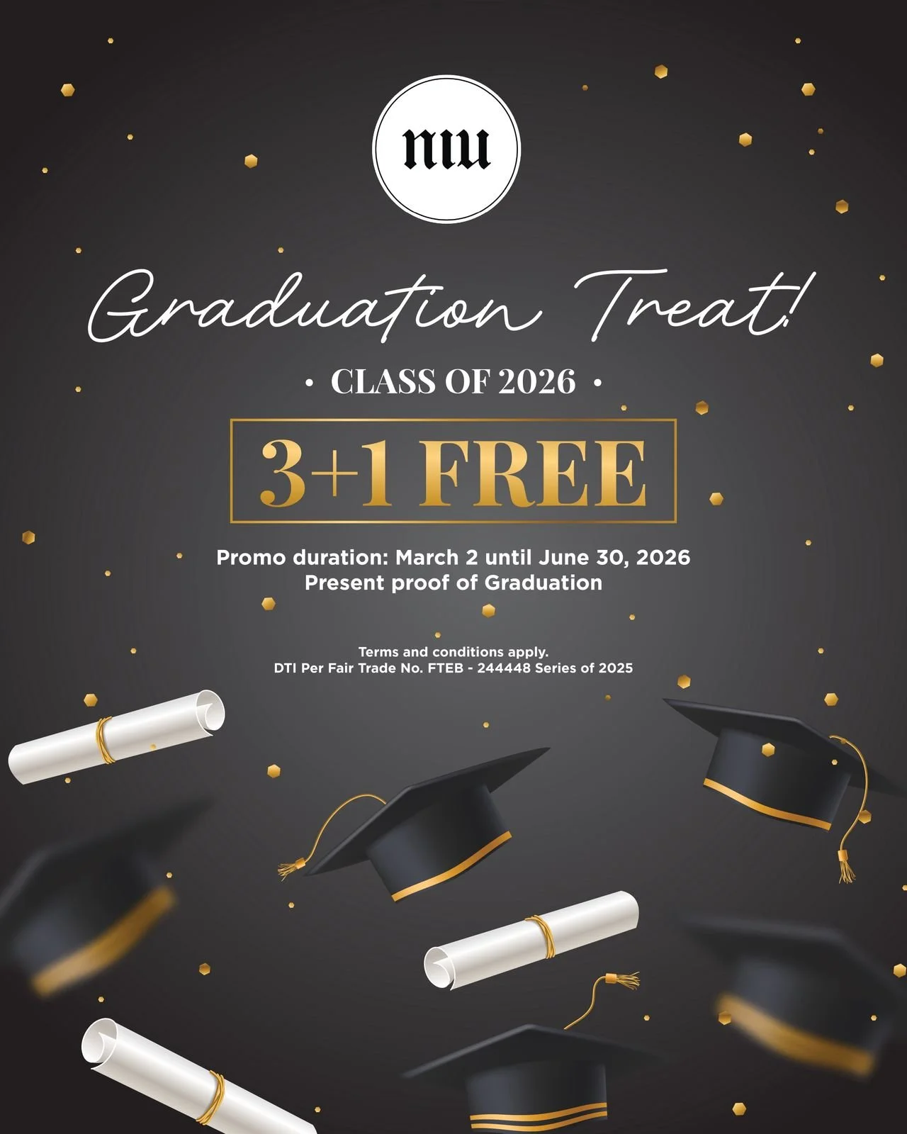 All graduates of the Class of 2026, including Kindergarten, Elementary, High School, College, and Postgraduate students, are eligible to avail of a FREE BUFFET when dining in with three (3) full-paying adults. *EXCLUDING NYX ONE AYALA