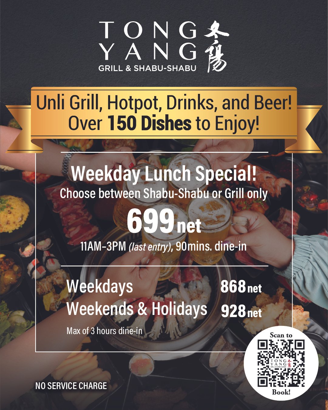 Weekday Lunch Special Rate: Guests may choose between Shabu-Shabu Only or Grill Only for ā±699 net per person.