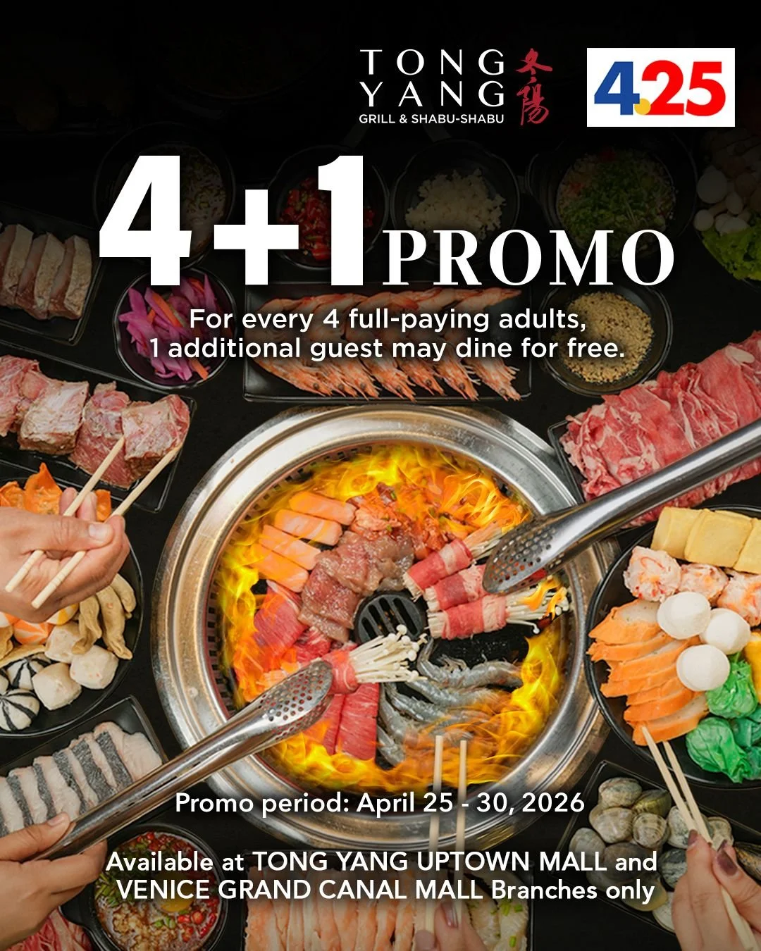1. Tong Yang UPTown, Tong Yang Venice, NIU Aura & Alley BGC will do 4+1 promo. For every 4 full-paying adults,1 additional guest may dine for free.