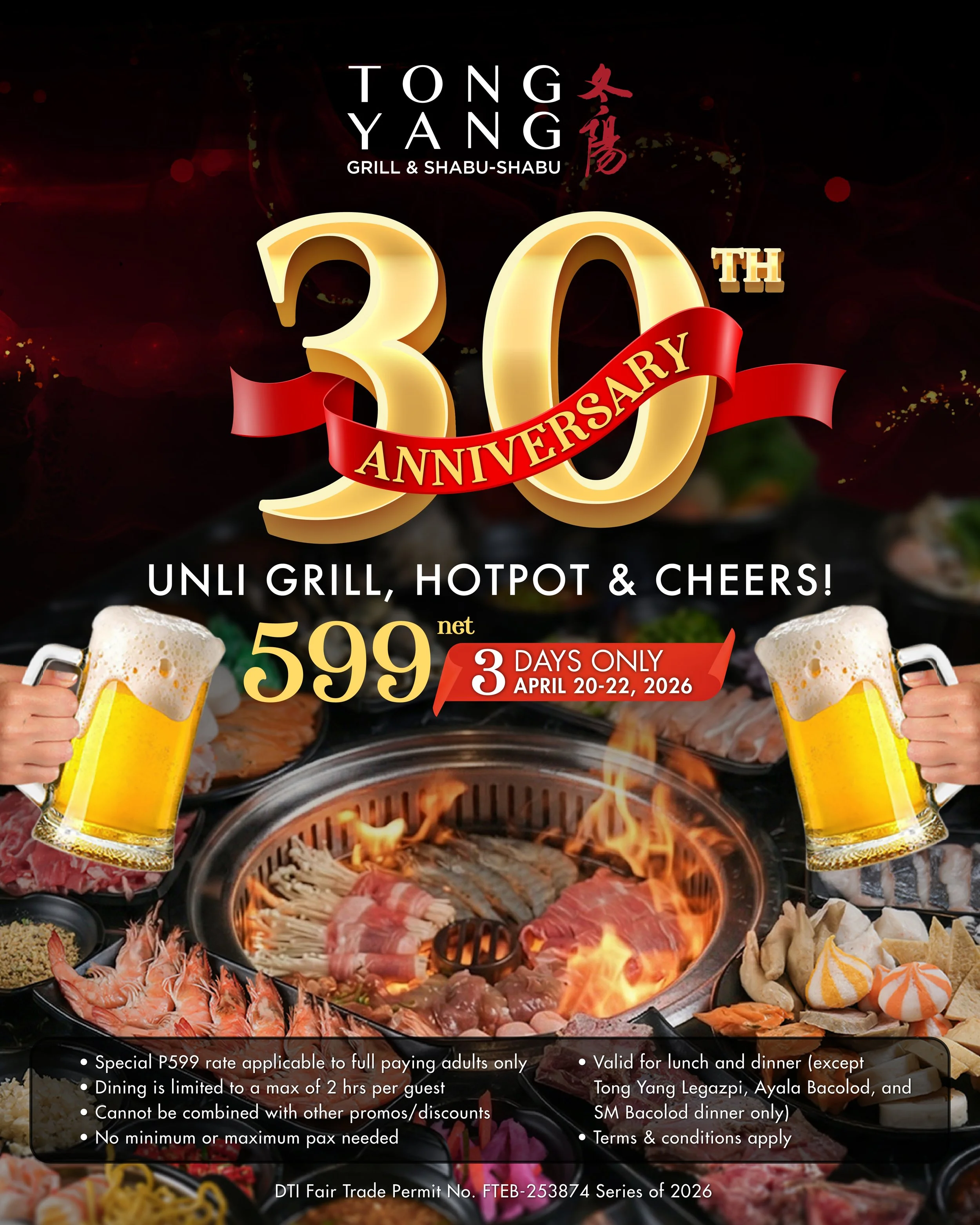 Tong Yang Legazpi, Ayala Bacolod & SM Bacolod will offer Express Rate (₱528) for lunch and Special Anniversary Rate (₱599) for dinner.