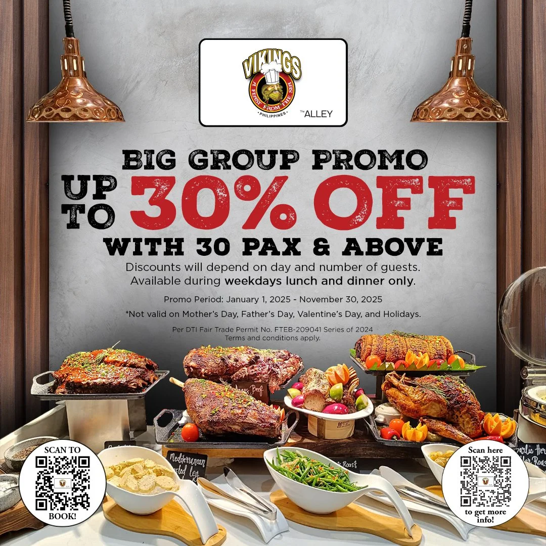 2. Promo discounts are available for walk-ins and reservations at all Vikings, The Alley branches.