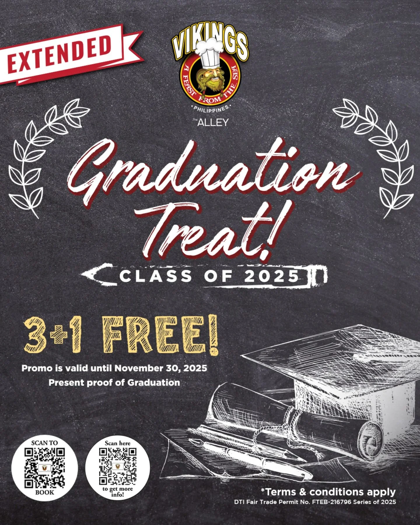 All graduates of the Class of 2025, including Kindergarten, Elementary, High School, College, and Postgraduate students, are eligible to avail of a FREE BUFFET when dining in with three (3) full-paying adults.